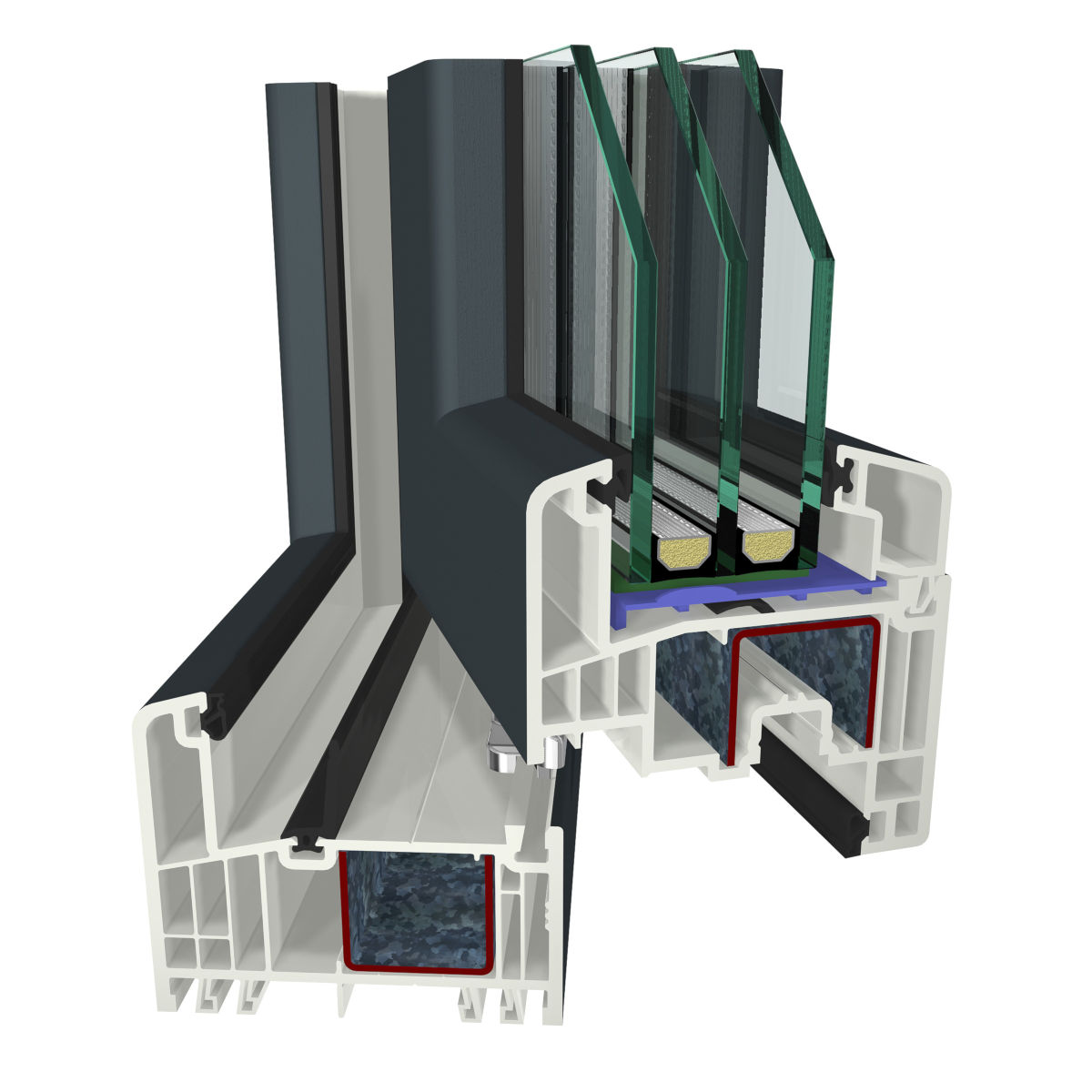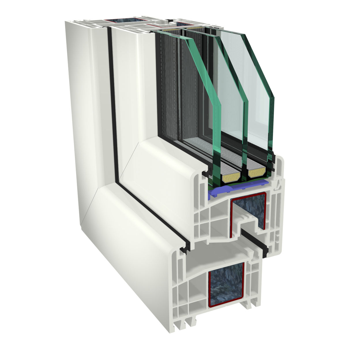 - 82,5 mm vastag 6 kamrás fő profilokkal, a keret Uf értéke 0,89-0,92 W/m²K