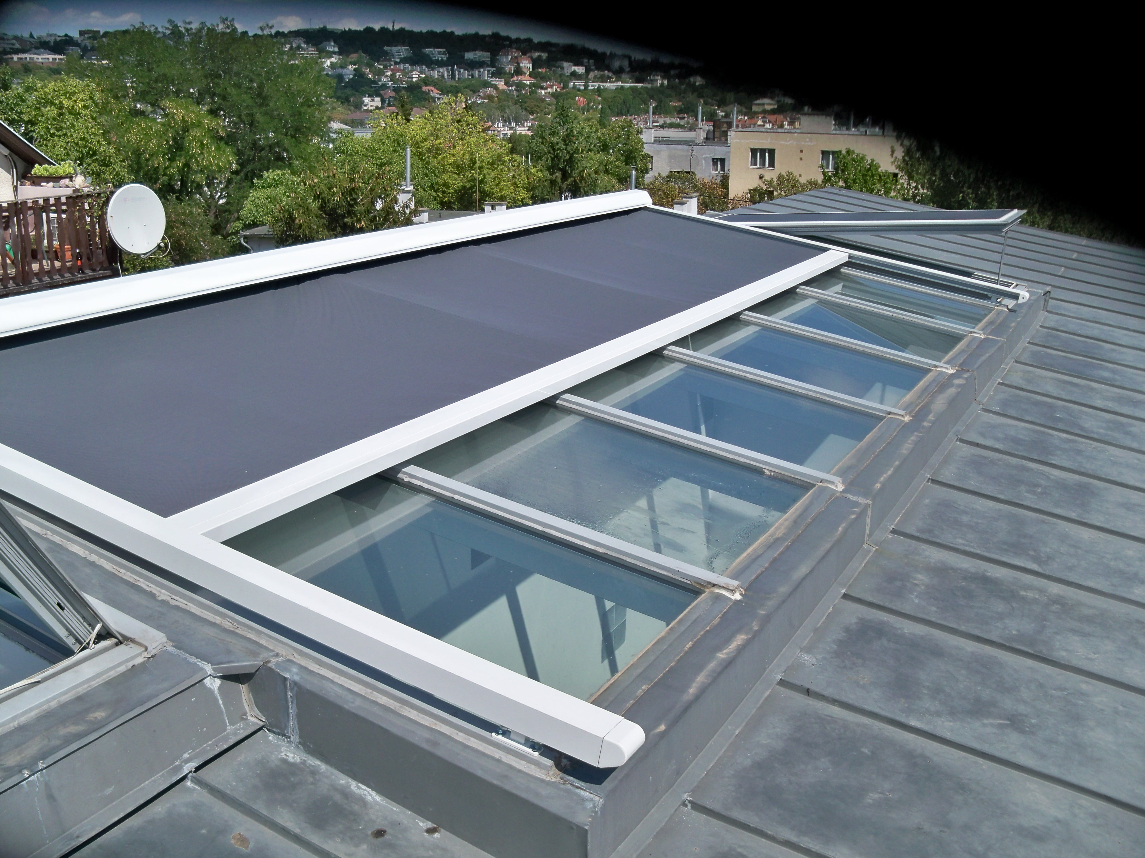 - A ponyva ugyanúgy egy tengelyről csavarodik le, de mindvégig masszív tokszerkezetben fut. Ezáltal stabilabb a könyökkaros napellenzőnél.